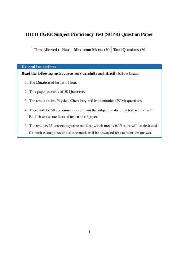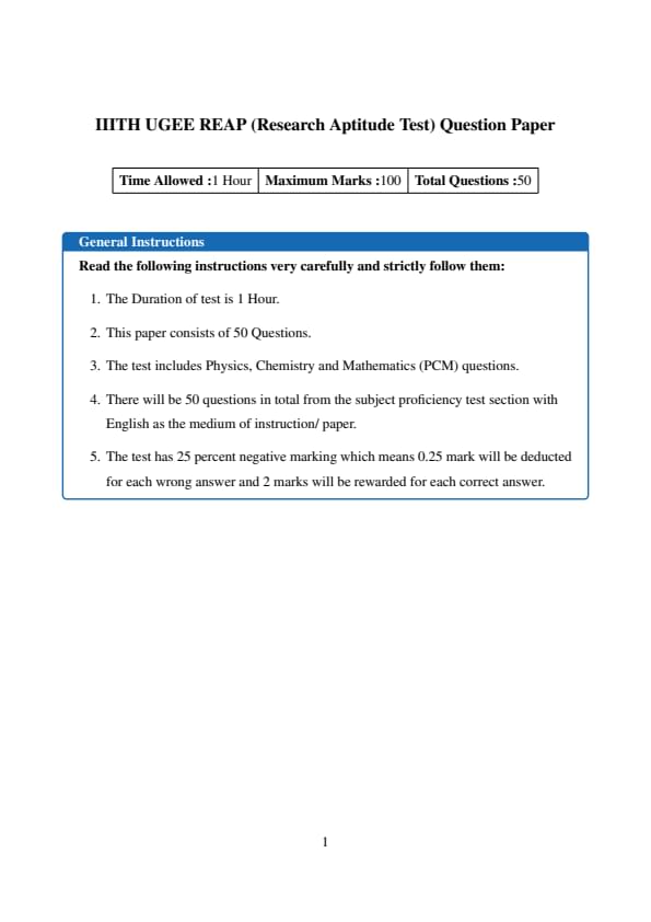 IIITH UGEE 2024 Question paper with Solutions PDF for the May 4 exam will be available here for download. IITH UGEE 2024 question paper (May 4, 2024) is divided into 2 sections: Subject Proficiency Test (SUPR) and Research Aptitude Proficiency Test (REAP).