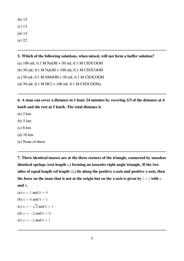 Three identical masses are at the three corners of the triangle, connected by massless identical springs (rest length \( l_0 \)) forming an isosceles right angle triangle. If the two sides of equal length (of length \( 2l_0 \)) lie along the positive x-axis and positive y-axis, then the force on the mass that is not at the origin but on the x-axis is given by \( \hat{i} + \hat{j} \) with \( a \) and \( b \).