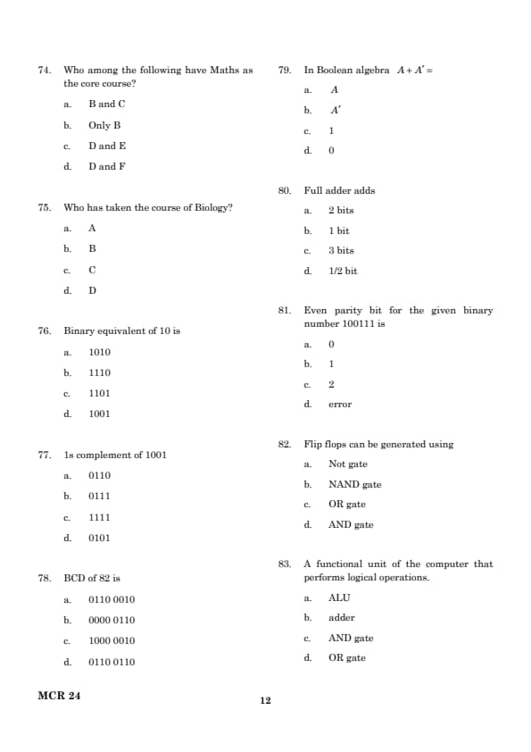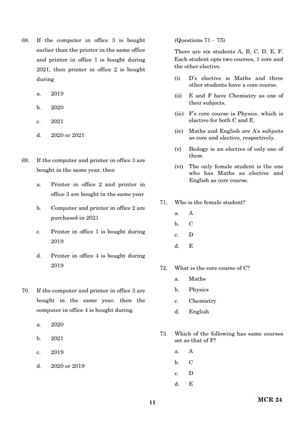 Step 2: Based on this, the core course of C must also be Physics. Quick Tip: To find a specific course in such logical setups, always refer to the relationships defined between students and their courses.