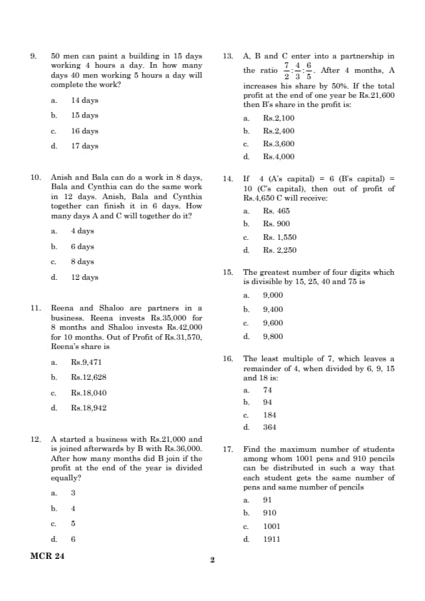 The total ratio = \(2 + 3 = 5\) \[ Reena's Share = \frac{2}{5} \times 31570 = 12628 rupees \] Quick Tip: When dividing profits based on investment, calculate the time-adjusted contribution of each partner to determine their respective shares accurately.