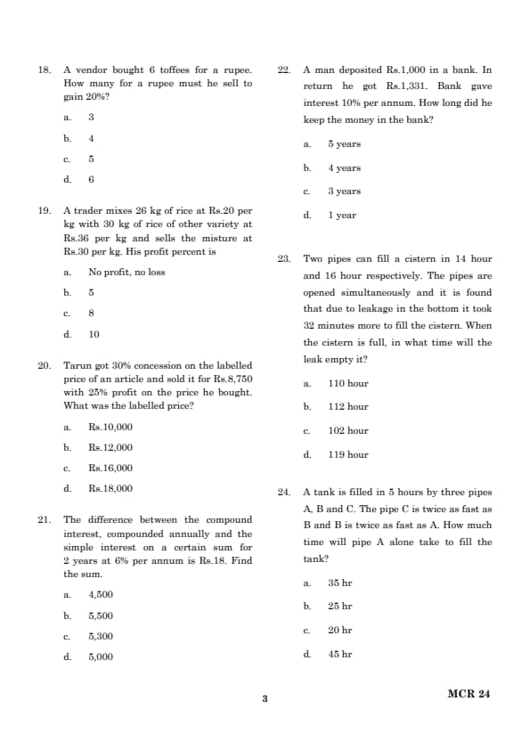Where \( P = 36000 \) rupees, \( r = 0.06 \) (6%), and \( t = 4 \) years. \[ I = 36000 \times 0.06 \times 4 = 8640 rupees \] Quick Tip: When calculating interest over multiple years, multiplying the rate by the number of years provides the total percentage of interest accrued.