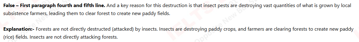 Explanation: The first paragraph states that at a rate of 1% per year, Madagascar's forests are being turned into agricultural land. Rice cultivation, which is the main staple crop in the nation, is a major contributor to this destruction. And a major contributing factor to this destruction is the fact that insect pests are decimating a significant portion of the food produced by the area's subsistence farmers, forcing them to clear forest to make room for new paddy fields. This implies that forests are being destroyed mainly by the cultivation of rice. The given statement does not correspond to the information in the first paragraph and therefore it is false.