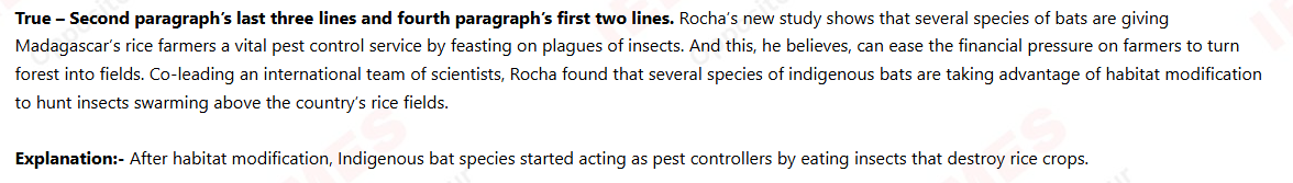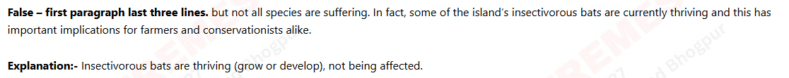 Explanation: According to the first paragraph , not all species on the island are suffering as a result of the destruction of the forests, which has resulted in catastrophic habitat loss and biodiversity loss. In fact, some of the insectivorous bats on the island are currently thriving, which has significant implications for both farmers and environmentalists. This implies insectivorous bats are only thriving because of their devastating habitat. They do not affect them. The given statement contradicts and is therefore a false statement.