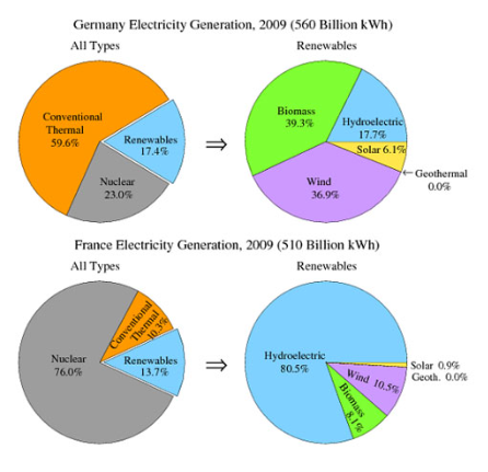 These pie charts compare the source of the electrical era in France and Germany in 2009. centering on all sorts of vitality and renewables. Generally, it is obvious that routine thermal vitality was the prevailing source in Germany, whereas France for the most part depended on atomic control. Be that as it may, in terms of renewable sources, biomass is basically utilized by Germany, though France intensely utilizes hydroelectric control.