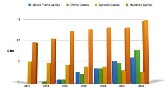 It can be seen clearly that handheld diversions stay a steady rise from around $ 11 billion in 2000 and reach a top at $18 billion of dollars in 2006.