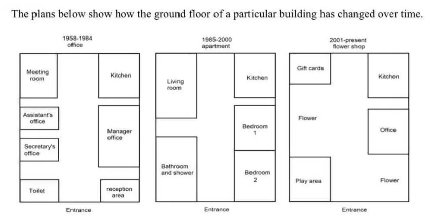 IELTS writing task 1 is a part of the IELTS exam where a diagram is given and the candidate has to explain the details mentioned in the diagram. The test will display the writing skills of candidate. Map of a Ground Floor in a Building and Containing 3 Maps IELTS Writing Task 1 is a question where the candidate has to analyze the chart showing the plan of a building in different years. The candidate has to analyze the changes that happened in the plan.