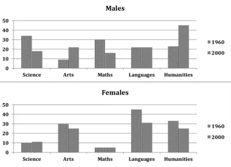 The bar charts examine the chances of male and girl college students getting pinnacle grades in 5 subjects, that are technological know-how, arts, math, languages, and arts in 1960 and 2000.