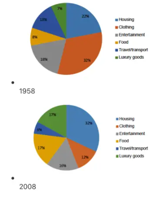 The chart below shows the proportion of people's total spending in a particular European country was spent on different commodities and services in 1958 and in 2008.