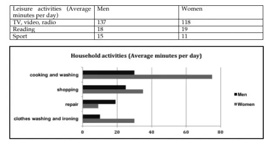The table and bar graph below show time spent on leisure and household activities in the UK. Summarise the information by selecting and reporting the main features, and make comparisons where relevant.
