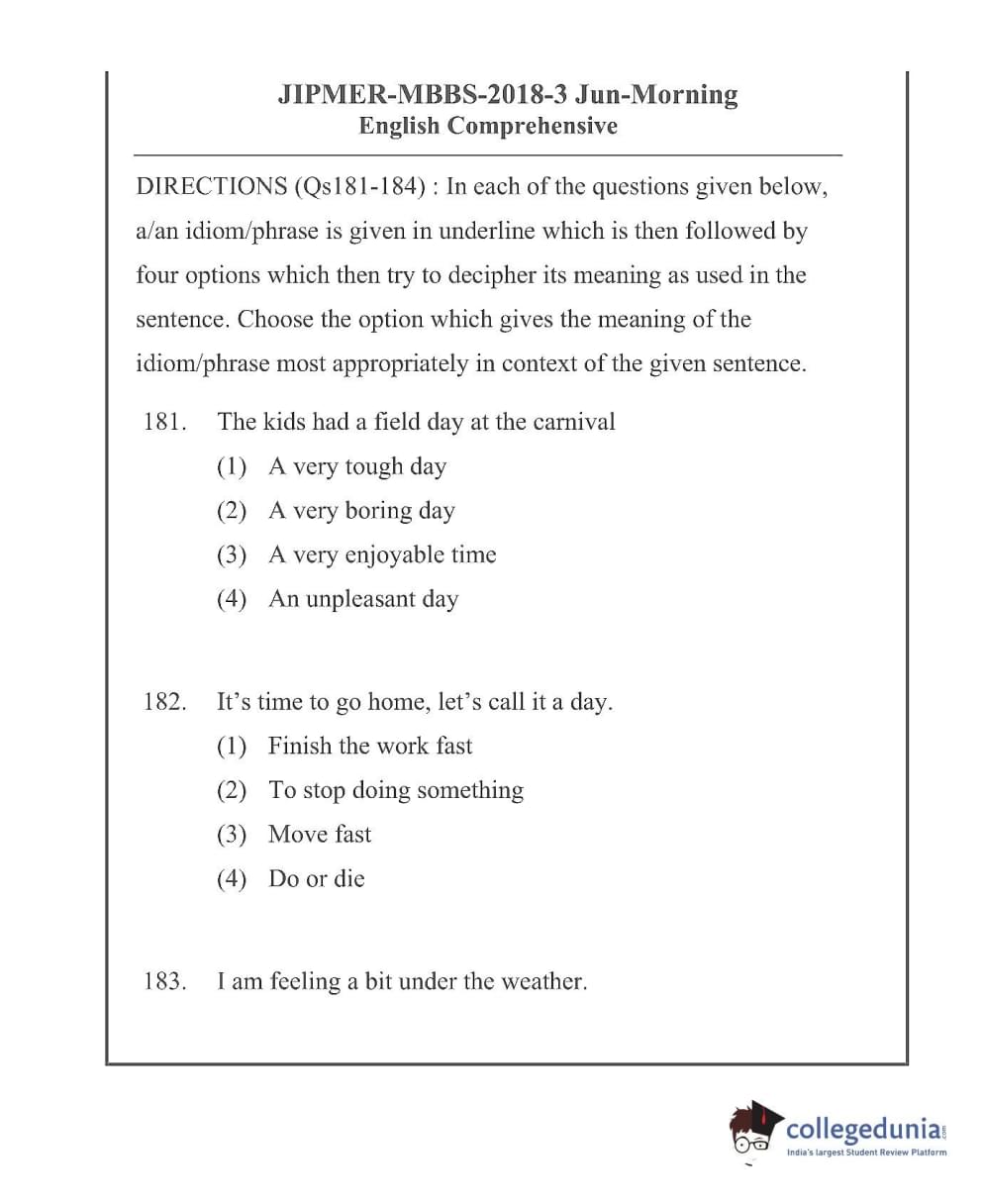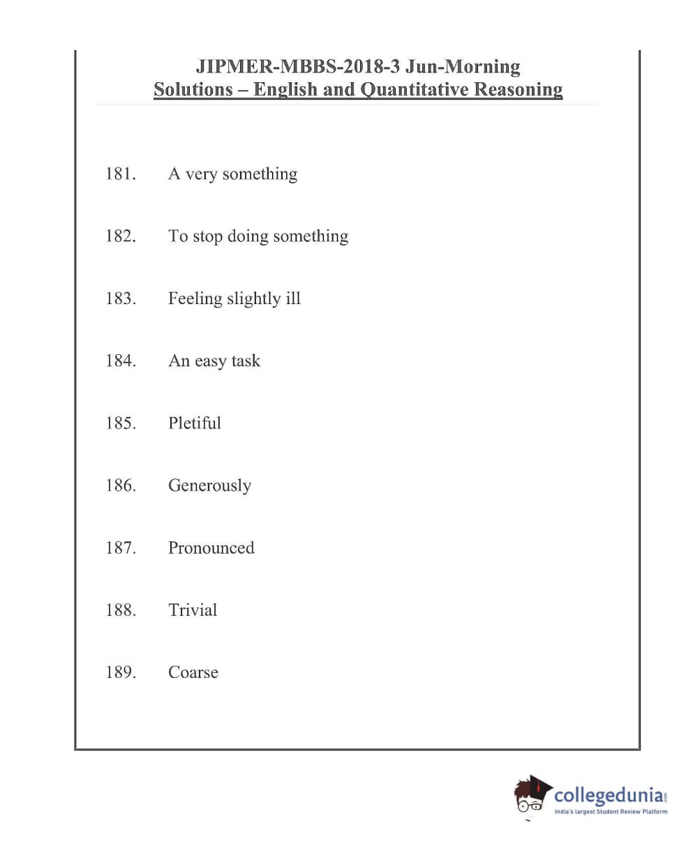 JIPMER 2018 Question paper with answer key pdf conducted on June 3, 2019 in Morning Shift is available for download. The exam was successfully organized by Jawaharlal Institute of Postgraduate Medical Education and Research (JIPMER). The question paper comprised a total of 200 questions.